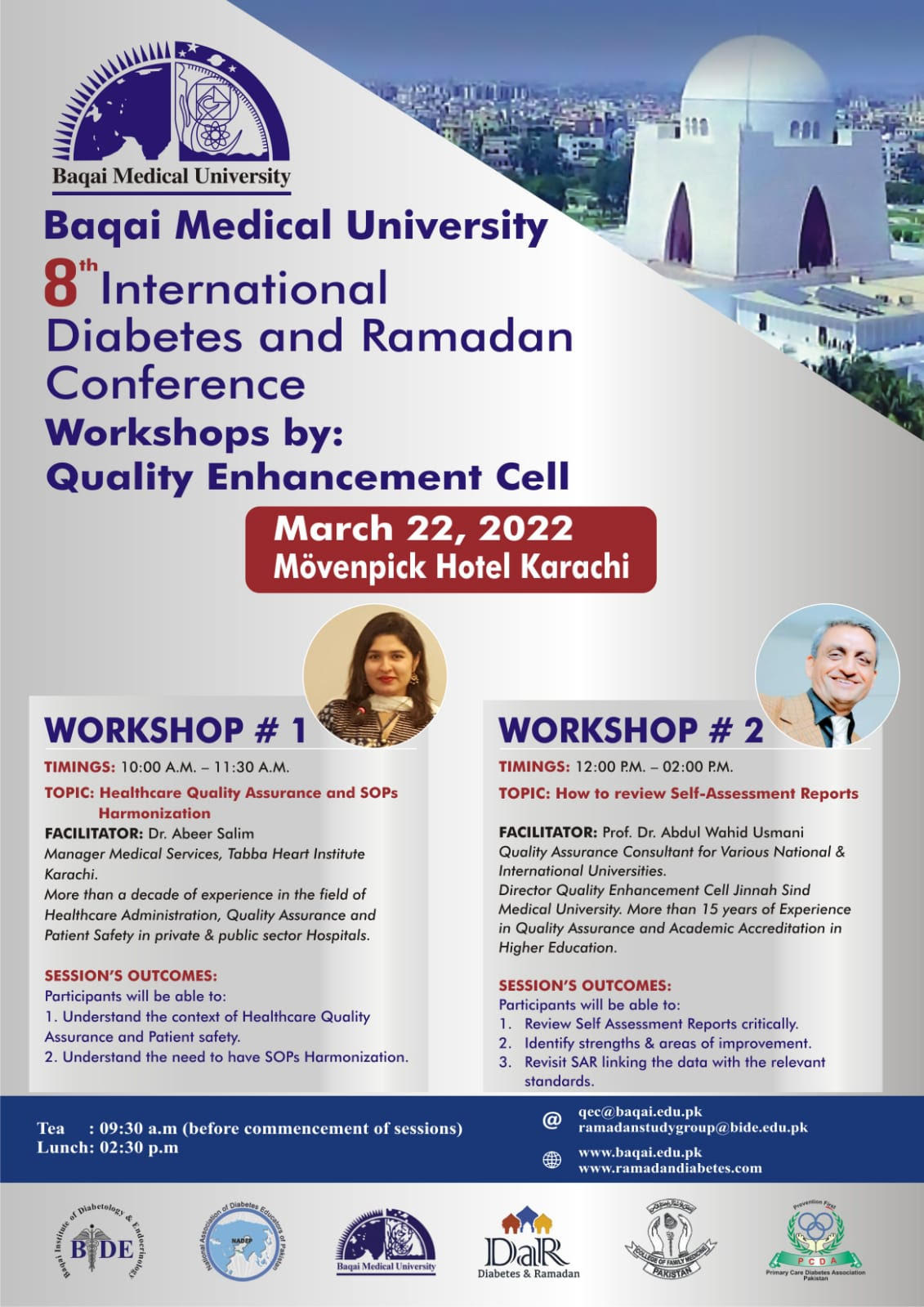 Quality Enhancement Cell, Baqai Medical University in collaboration with Baqai Institute of Diabetology & Endocrinology (BIDE) is organizing workshops, as a part of their International Conference, for faculty training/development at Movenpick Hotel, Karachi on Tuesday 22nd March 2022 from 9:00 am to 2:00 pm followed by Lunch.